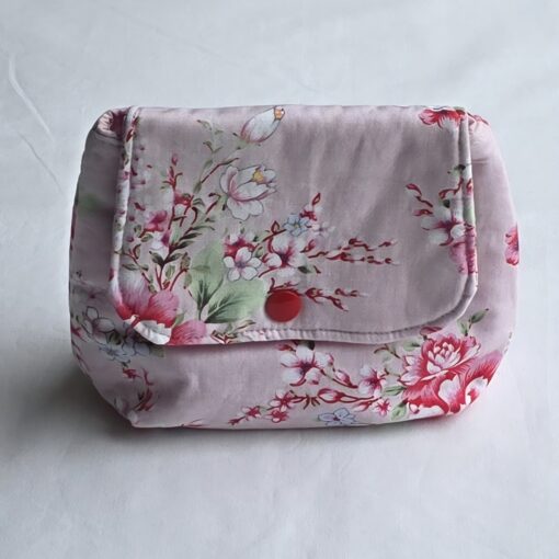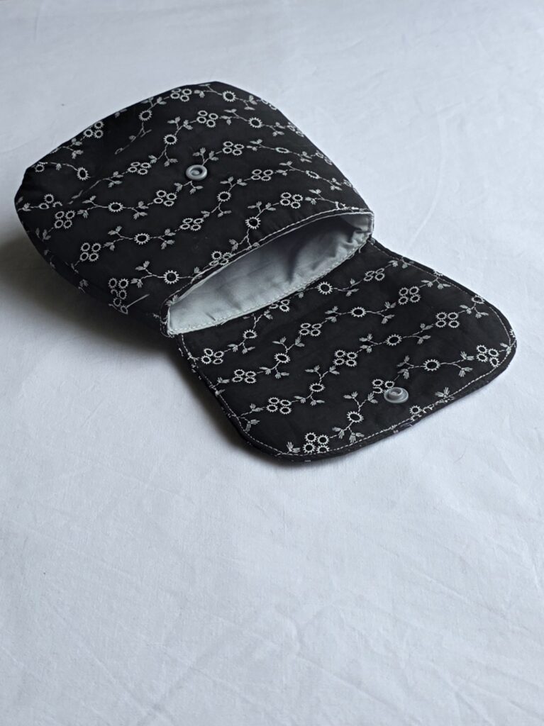 Le tissu extérieur présente un fond noir parsemé de fleurs blanches délicates, créant un contraste raffiné et sobre. L’intérieur clair ajoute une touche de lumière et facilite la visibilité du contenu, tout en conservant une palette neutre et élégante. Fermeture par bouton pression : La pochette se ferme grâce à un bouton pression, visible sur le rabat et le corps. Ce système est pratique, rapide et sécurisant, tout en apportant une touche discrète au design. N°606 – 15x12x5 – 12€