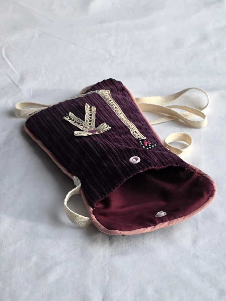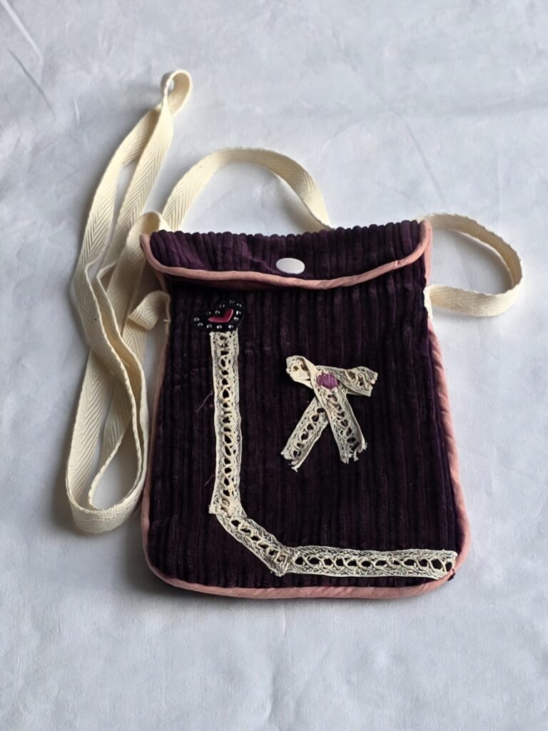 Cor Duroy, denim, doublures à carreaux, sangles, dentelles, patchs… Chaque élément sont issu de chutes de textiles et de vêtements , valorisés avec soin. Violet profond, rose tendre, crème, touches de rouge. Décorations dentelles , petits cœurs, patchs, étiquettes fleuries…Textures variées : Le mélange de velours côtelé, de coton imprimé et de détails brodés donne du relief et du caractère. Ce sac raconte une histoire visuelle, entre tendresse et fantaisie. N°614 – 10×18 – 15€