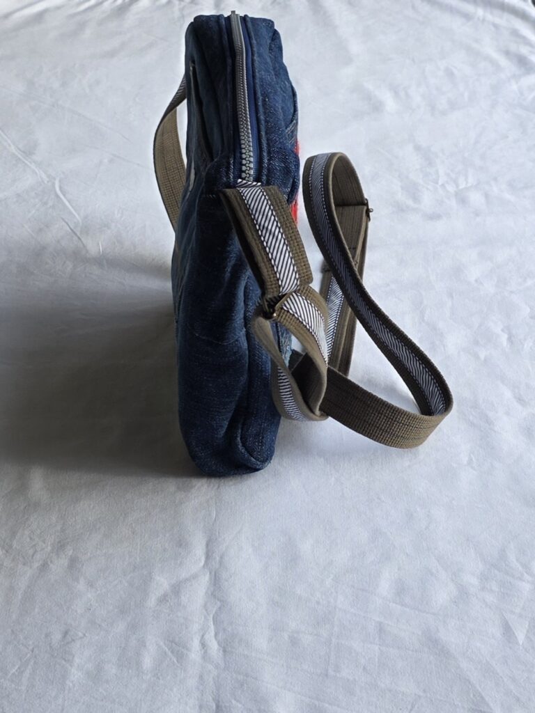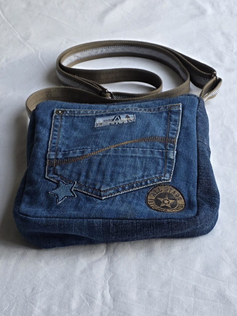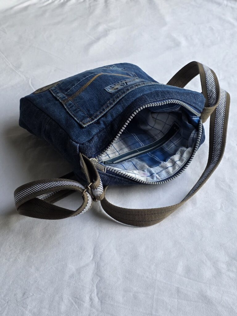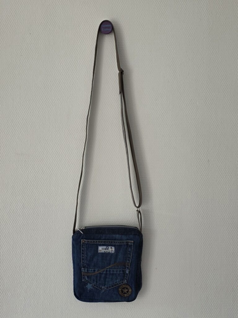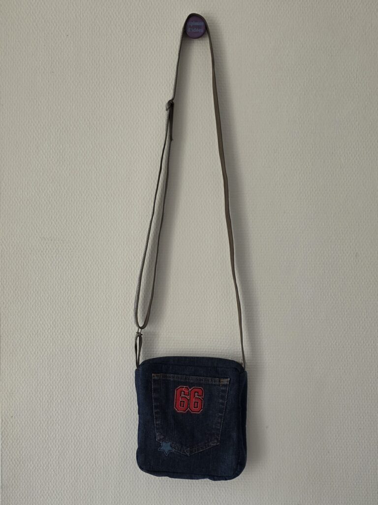 Le sac est confectionné à partir de denim recyclé. La poche arrière  et avant de jean est réutilisée en façade, avec ses coutures d’origine, un chiffre brodé (« 66 ») et deux petit patch et deux  en forme d’étoile, des éléments qui renforcent l’identité upcyclée de la pièce. Sangle : En tissu kaki à rayures blanches et bleu, elle contraste avec le bleu du denim et ajoute une touche sportive et urbaine. une poche intérieur avec fermeture éclair . Le sac est équipé d’un zip solide, garantissant une fermeture sécurisée et pratique pour un usage quotidien. N°619 – 19x20x5 – 39€