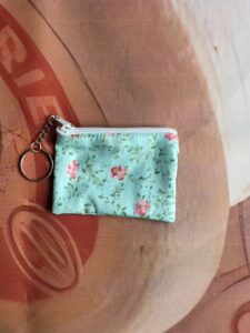 accessoire porte monnaie Fleur Azur Elle est équipée d’une fermeture éclair blanche . Réalisée dans un tissu bleu ciel décoré d’un motif floral délicat (petites fleurs roses et feuillage vert). N° 645 – 8×6 – 4€