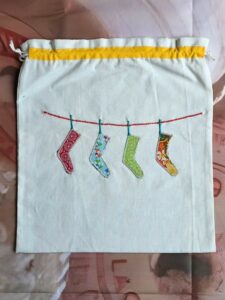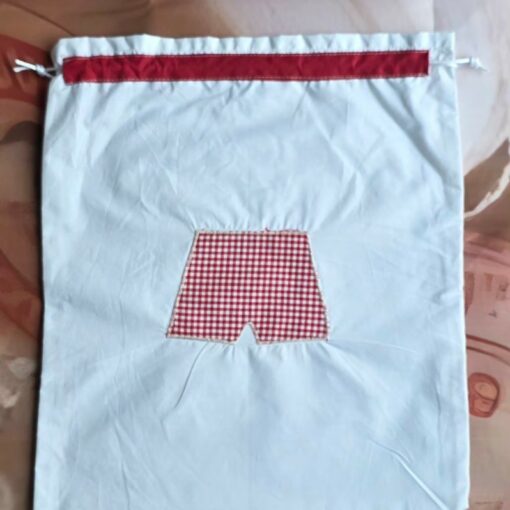 « Les Petites Tendues » est une pochette textile artisanale pleine de tendresse et de fantaisie. Sur un fond blanc éclatant, quatre chaussettes aux motifs variés — rouge à cercles, bleu à imprimés animaux, vert à pois et jaune fleuri — sont suspendues à une corde rouge brodée, retenues par de petites pinces bleues cousues main. Une bande jaune lumineuse souligne le haut du sac, ajoutant une touche solaire à cette scène poétique. Matériaux : coton blanc, bande jaune en tissu recyclé, appliqués textiles variés. Fermeture : cordon coulissant en coton. Technique : broderie Entretien : lavage doux. n° 657 – 30×35 – 12€