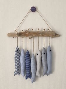 Chaque poisson est réalisé à partir de chemises recyclées, dans des teintes douces et naturelles (gris uni, rayures discrètes), et ponctué d’un œil noir cousu avec délicatesse. Les éléments en bois flotté apportent une touche brute et organique, contrastant avec la douceur textile. N° 681 – 40×38 – 25€